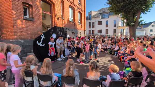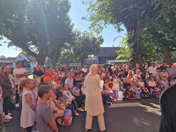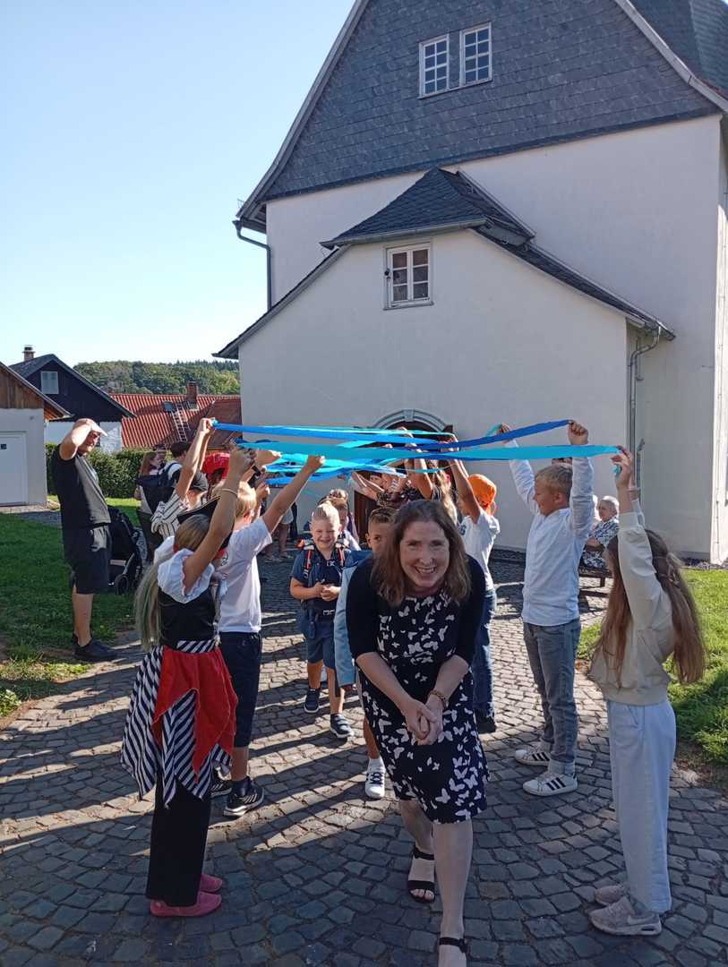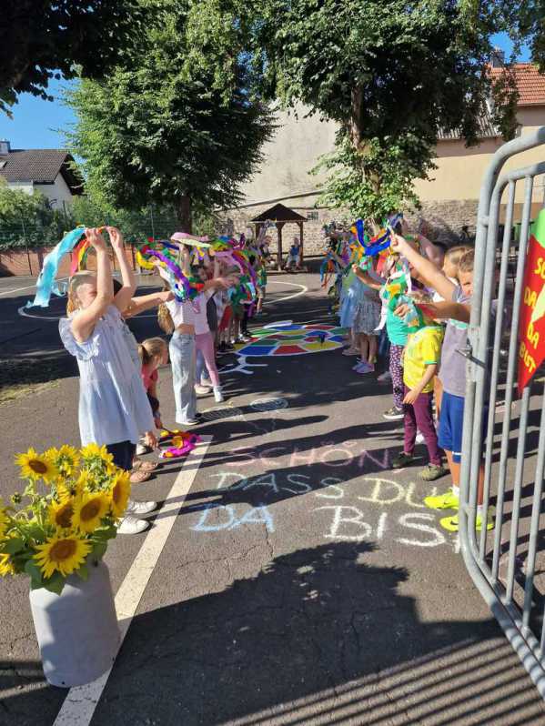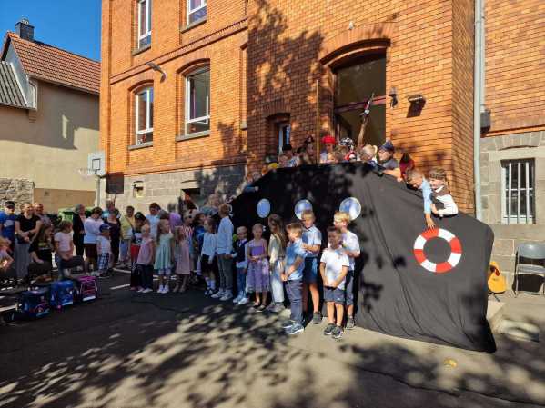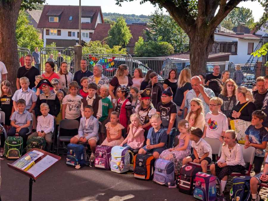 Am Dienstag, den 19.08.2025 wurden die neuen Schülerinnen und Schüler der Jahrgangsstufe 1 zunächst von ihren Patinnen und Paten aus der 4. Klasse vor der Kirche abgeholt und zum Schulgebäude begleitet, wo sie dann von der restlichen Schulgemeinde auf dem Schulhof begrüßt wurden. Als alle auf dem Schulhof versammelt waren, wurde von den Schülerinnen und Schülern aus der Jahrgangsstufe 4 noch ein Musical zum Schulanfang aufgeführt.